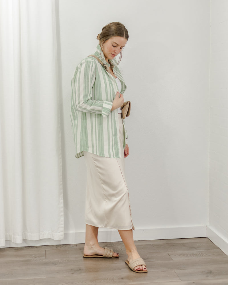 The gathering at the waist of the Brenda Satin Skirt mimics the knot of a wrap skirt without having to deal with the fuss of actually tying it! This midi skirt is oh so flattering and in a beautiful champagne color that goes with everything yet is still unique.